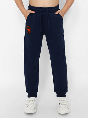 Брюки для мальчика с накладными карманами с клапаном. Нижние срезы брюк оформлены притачными манжетами из полотна с эластаном. Пояс притачной, с резинкой и функциональным шнуром. На карман настрочена декоративная жаккардовая этикетка.